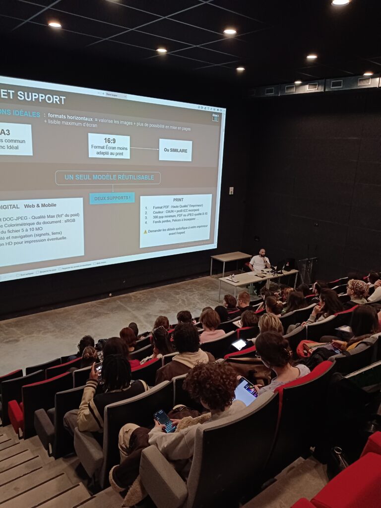 Ce moment d’accompagnement individualisé a permis d’aller au-delà de la conférence générale. Mise en page, hiérarchie des images, lisibilité, orientation artistique, cohérence de l’ensemble : autant de points concrets qui font la différence au moment d’entrer dans la vie professionnelle. Pour les étudiants, cet instant en face à face constitue une étape précieuse, à la fois pour mesurer leurs acquis et pour identifier les pistes d’amélioration avant leur entrée sur le marché du travail.