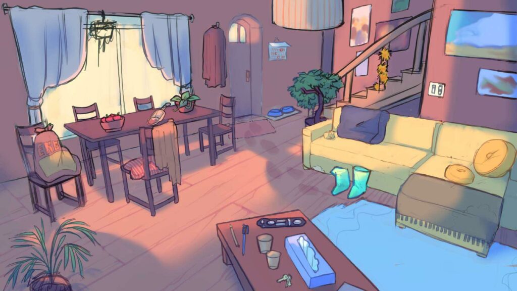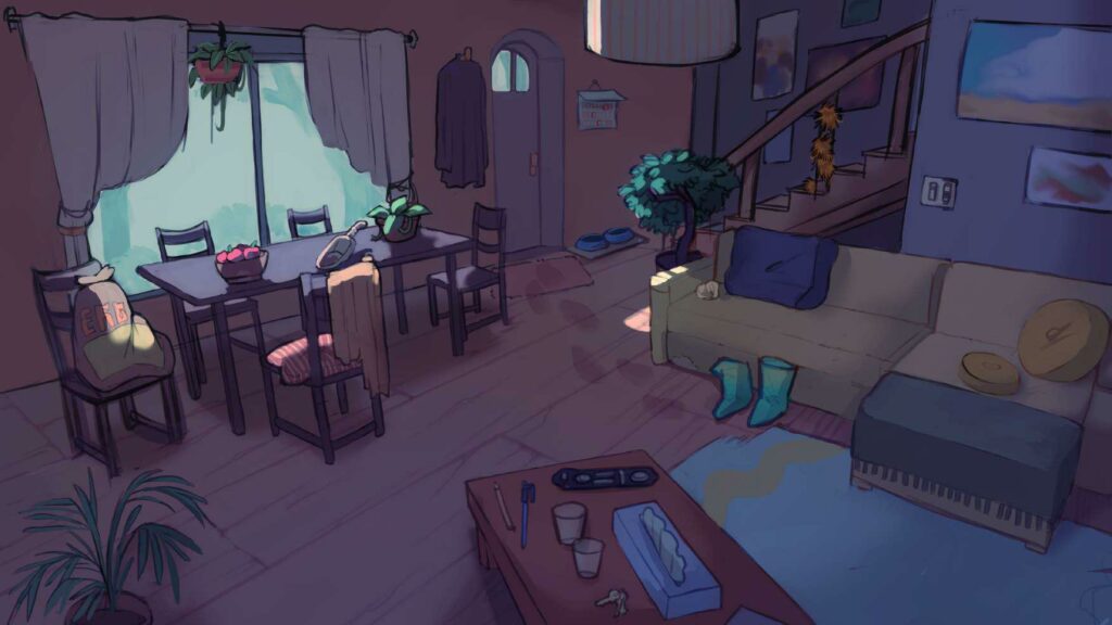 Move on Day affirme sa signature visuelle par un contraste fort entre deux registres le présent avec des couleurs vives et délimitées en contraste avec les souvenirs avec un rendu plus esquissé, flou, parfois terne où les textures et gestes évoquent l’imperfection de la mémoire.